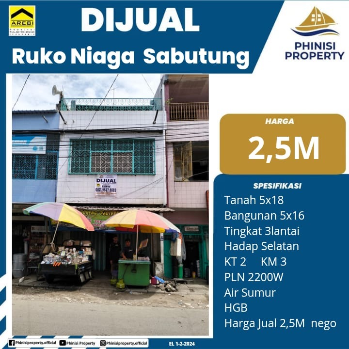 Mencari properti komersial strategis yang nyaman untuk bisnis dan hunian? Ruko Niaga Sabutung adalah pilihan yang tepat. Ruko ini memiliki luas tanah 5 x 18 meter dan luas bangunan 5 x 16 meter, terdiri dari 3 lantai. Dilengkapi dengan 2 kamar tidur dan 3 kamar mandi, properti ini menghadap ke Selatan dan memiliki fasilitas air sumur serta daya listrik 2.200 watt. Dengan Sertifikat Hak Guna Bangunan (HGB), ruko ini sangat cocok untuk berbagai jenis usaha dan merupakan investasi properti yang sangat menguntungkan di lokasi yang strategis.