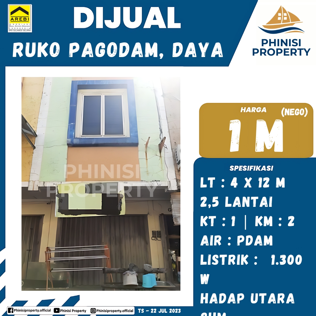 Dijual segera, ruko Pagodam (Pasar Grosir Daya Modern) di kawasan Daya, lokasi yang sangat strategis untuk Anda yang mencari tempat usaha atau aset investasi. Ruko ini memiliki luas tanah 48 m² (4 meter x 12 meter) dengan luas bangunan 2,5 lantai. Dengan 1 kamar tidur dan 2 kamar mandi, ruko ini sudah dilengkapi dengan fasilitas PDAM dan listrik berdaya 1.300 watt. Menghadap utara, ruko ini menawarkan visibilitas yang baik dan mudah diakses, ideal untuk berbagai jenis bisnis. Jangan lewatkan kesempatan emas untuk memiliki properti di lokasi yang terus berkembang ini.