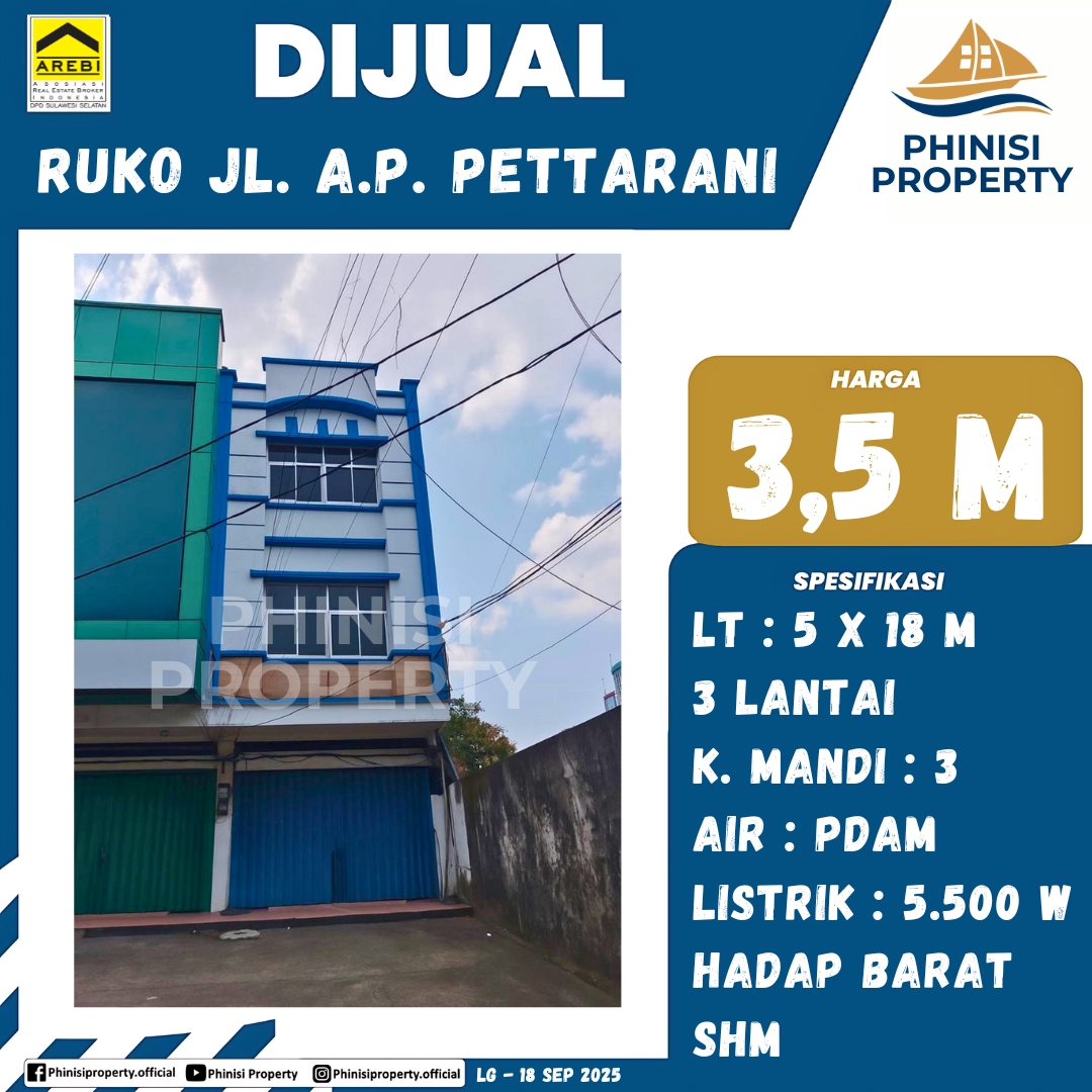 Dijual ruko tiga lantai yang berlokasi strategis di Jalan A.P. Pettarani, Makassar. Ruko ini memiliki luas tanah 90 meter persegi, didapat dari perkalian 5 meter kali 18 meter.