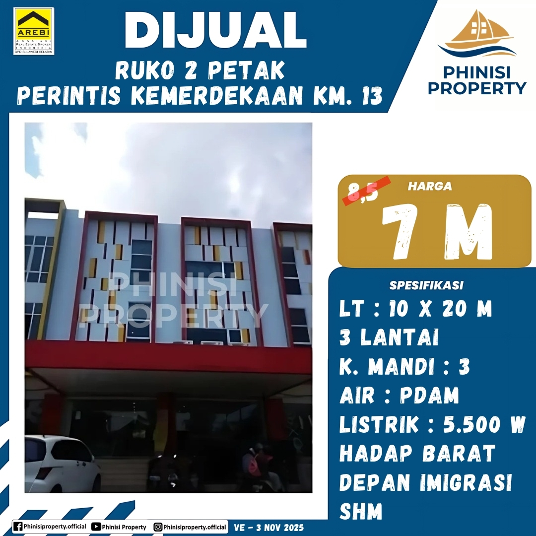 Miliki ruko premium di lokasi sangat strategis, tepat di depan Kantor Imigrasi, Jl. Perintis Kemerdekaan, Makassar. Ruko ini dijual dengan harga 8,5 Milyar. Memiliki luas bangunan (LB) 9 x 18 m dengan 3 lantai, ruko ini dilengkapi 3 kamar mandi, akses air PDAM, dan daya listrik 5.500 W. Posisi menghadap Barat dan berstatus SHM (Sertifikat Hak Milik) menjamin legalitas serta visibilitas yang tinggi untuk berbagai jenis usaha. Properti komersial ini adalah investasi yang ideal di jantung aktivitas kota Makassar. Hubungi Phinisi Property untuk informasi lebih lanjut dan jadwalkan kunjungan Anda.