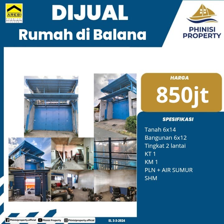 Dijual rumah dua lantai di kawasan Balana dengan lokasi strategis. Rumah ini memiliki luas tanah 6 x 14 meter dan luas bangunan 6 x 12 meter, sangat cocok untuk dijadikan hunian sekaligus tempat usaha. Dengan 1 kamar tidur dan 1 kamar mandi, properti ini juga dilengkapi dengan fasilitas listrik PLN dan air sumur. Legalitasnya pun sudah terjamin dengan Sertifikat Hak Milik (SHM). Properti ini adalah pilihan yang sangat menarik untuk Anda yang mencari rumah serbaguna dengan harga kompetitif.