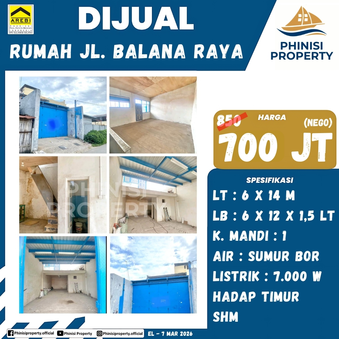 Dijual rumah dua lantai di kawasan Balana dengan lokasi strategis. Rumah ini memiliki luas tanah 6 x 14 meter dan luas bangunan 6 x 12 meter, sangat cocok untuk dijadikan hunian sekaligus tempat usaha. Dengan 1 kamar tidur, properti ini juga dilengkapi dengan fasilitas listrik PLN dan air sumur. Legalitasnya pun sudah terjamin dengan Sertifikat Hak Milik (SHM). Properti ini adalah pilihan yang sangat menarik untuk Anda yang mencari rumah serbaguna dengan harga kompetitif.