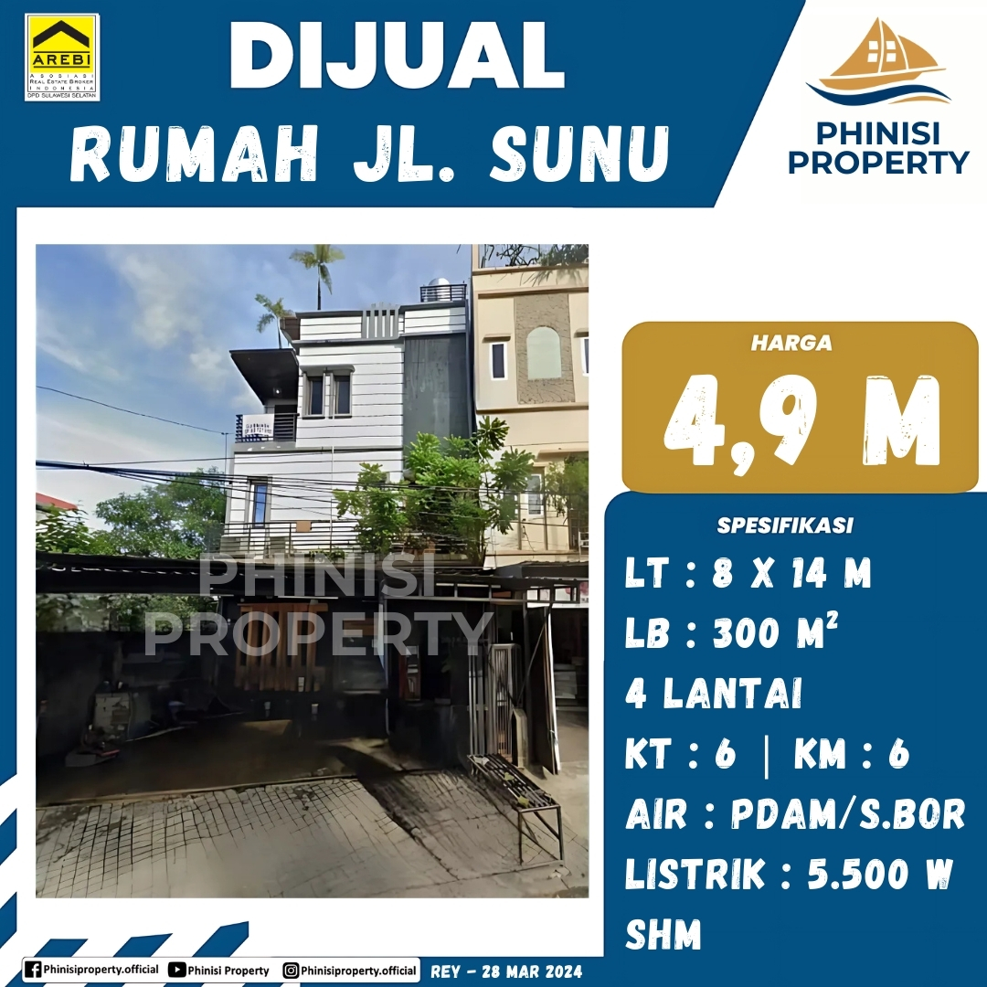 Dijual sebuah rumah megah di lokasi strategis Jalan Sunu, cocok untuk keluarga besar atau dijadikan kos-kosan. Dengan luas tanah 8x14 meter dan luas bangunan 300m² yang terdiri dari empat lantai, rumah ini memiliki enam kamar tidur dan enam kamar mandi. Didukung dengan pasokan air PDAM/sumur bor dan daya listrik 5.500W, properti ini menawarkan kenyamanan optimal dan fleksibilitas penggunaan. Rumah ini bersertifikat SHM.