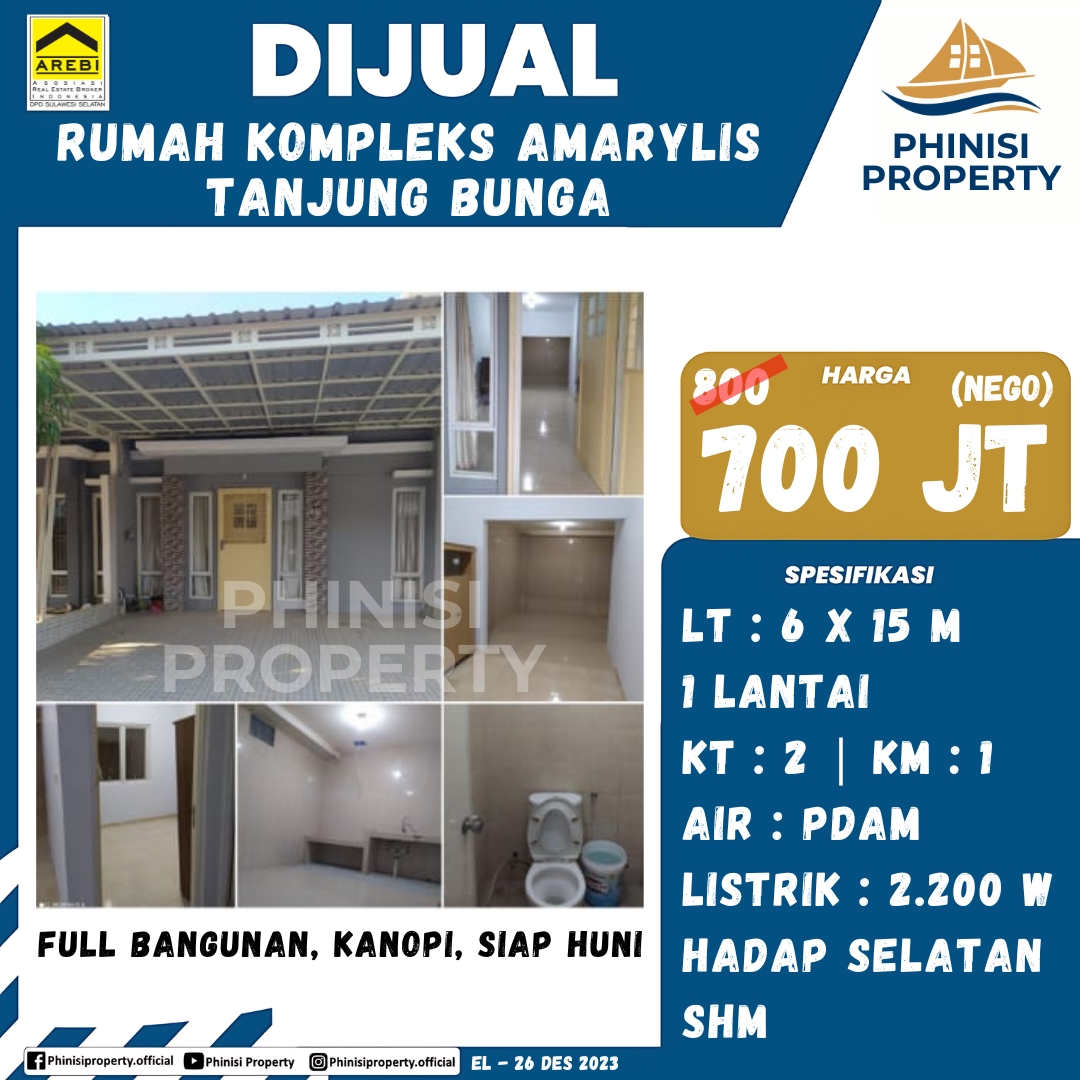 Rumah siap huni di Amarylis, Tanjung Bunga ini adalah pilihan ideal bagi Anda yang mencari hunian nyaman dan praktis. Berada di lokasi strategis KM 1, rumah satu lantai ini memiliki dimensi 6 x 15 meter dan sudah full bangunan. Dilengkapi dengan kanopi, rumah ini menawarkan kenyamanan ekstra dan tidak memerlukan renovasi. Properti ini memiliki 2 kamar tidur dan 1 kamar mandi, sangat cocok untuk keluarga kecil. Dengan fasilitas air PDAM dan daya listrik 2.200W, serta legalitas Sertifikat Hak Milik (SHM), rumah ini adalah pilihan yang aman dan menguntungkan. Properti ini ditawarkan dengan harga yang kompetitif, menjadikannya kesempatan yang tidak boleh dilewatkan.