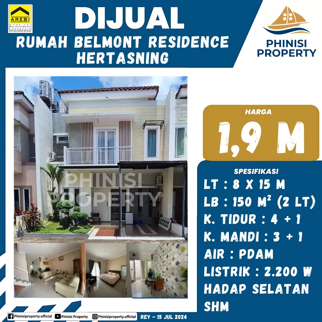 Dijual rumah mewah yang berlokasi di perumahan Belmont Residence Hertasning, cocok untuk keluarga yang mengutamakan kenyamanan dan gaya hidup modern. Dengan luas tanah 8x15 meter dan luas bangunan 150m² yang terdiri dari dua lantai, rumah ini memiliki 4+1 kamar tidur dan 3+1 kamar mandi. Dilengkapi dengan air PDAM dan daya listrik 2.200W, properti ini menawarkan kenyamanan optimal. Rumah ini menghadap selatan dan bersertifikat SHM.