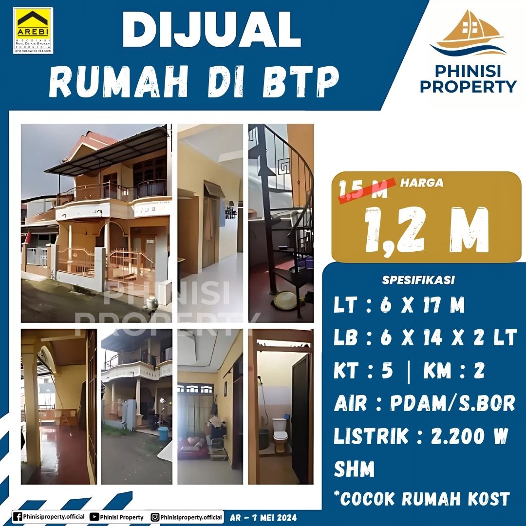 Tersedia rumah di BTP yang sangat cocok untuk tempat tinggal pribadi maupun dikonversi menjadi rumah kost. Properti dua lantai ini memiliki luas tanah 6 x 17 meter, dengan total 102 m², dan luas bangunan 6 x 14 x 2 lantai, dengan total 168 m². Rumah ini dilengkapi lima kamar tidur dan dua kamar mandi, pasokan air PDAM atau sumur bor, serta daya listrik 2200 watt. Dengan Sertifikat Hak Milik (SHM), properti ini menawarkan keamanan dan potensi keuntungan tinggi sebagai investasi.