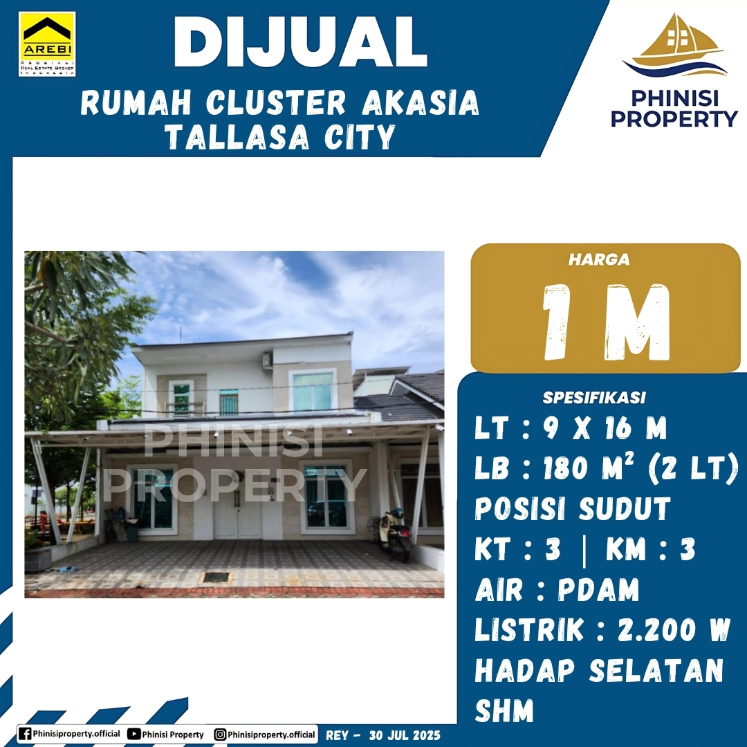 Dijual rumah 2 lantai yang berlokasi di Cluster Akasia, Tallasa City, sebuah hunian eksklusif dengan fasilitas lengkap. Properti ini memiliki posisi sudut yang strategis, dengan spesifikasi luas tanah 9 x 16 meter dan luas bangunan 180 meter persegi. Rumah ini dilengkapi dengan 3 kamar tidur dan 3 kamar mandi, sangat ideal untuk keluarga yang mencari kenyamanan dan privasi. Fasilitas yang tersedia mencakup air PDAM dan daya listrik 2.200 watt. Dengan sertifikat Hak Milik (SHM) dan posisi menghadap selatan, rumah ini menawarkan kombinasi sempurna antara lokasi premium, desain modern, dan legalitas terjamin, menjadikannya pilihan investasi properti terbaik di kelasnya.