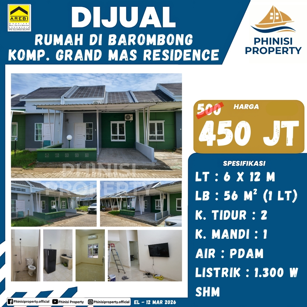Dijual rumah di perumahan Grand Mas Residence, Barombong, yang menawarkan hunian nyaman dan strategis. Rumah satu lantai ini memiliki dimensi 6 x 12 meter dengan luas tanah 72 m² dan luas bangunan 56 m², sangat cocok untuk keluarga kecil. Rumah ini dilengkapi dengan 2 kamar tidur dan 1 kamar mandi, serta memiliki dapur dan ruang makan. Fasilitas air PAM dan daya listrik PLN 1300 watt sudah tersedia, menjamin kenyamanan sehari-hari. Legalitasnya pun terjamin dengan Sertifikat Hak Milik (SHM). Properti ini adalah pilihan yang sangat menarik untuk Anda yang mencari rumah siap huni dengan harga kompetitif di kawasan Barombong.