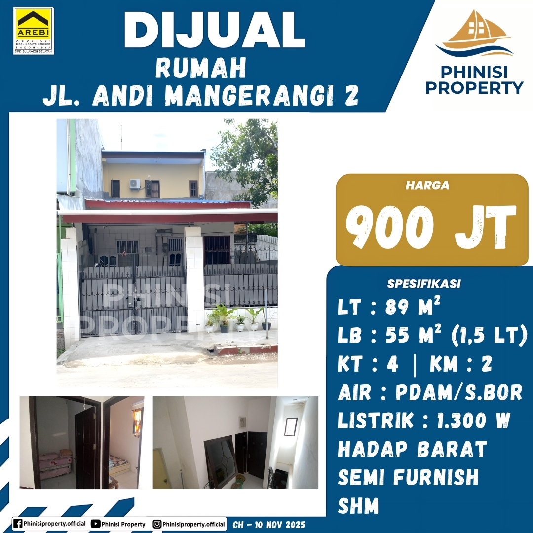Dapatkan kesempatan memiliki rumah siap huni di lokasi yang mudah diakses, yaitu Rumah di Jalan Andi Mangerangi 2. Properti ini sangat cocok untuk keluarga yang mencari hunian fungsional dengan harga yang kompetitif. Rumah ini memiliki Luas Tanah 89 M² dan Luas Bangunan 55 M² dengan 1,5 Lantai, memaksimalkan ruang vertikal. Meskipun ringkas, rumah ini menyediakan jumlah kamar yang memadai, yaitu 4 Kamar Tidur dan 2 Kamar Mandi. Kenyamanan harian didukung oleh pasokan air PDAM/Sumur Bor dan daya listrik 1.300 Watt. Properti dijual dalam kondisi *Semi Furnish* dan menghadap Barat. Legalitas rumah ini terjamin aman dengan sertifikat SHM (Sertifikat Hak Milik), menjadikannya pilihan investasi properti yang stabil di area strategis.
