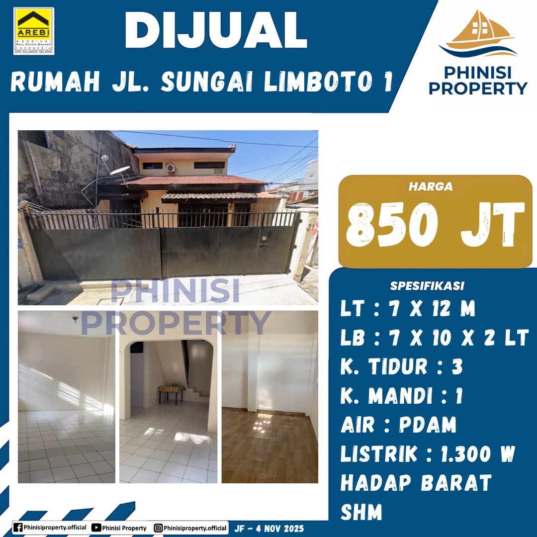 Dapatkan peluang memiliki rumah strategis dengan harga terjangkau di pusat kota, yaitu Rumah di Jalan Sungai Limboto 1. Properti ini sangat cocok untuk keluarga muda atau investasi jangka pendek, dengan dimensi Luas Tanah 7 x 12 meter. Rumah ini menawarkan ruang tinggal yang optimal dengan Luas Bangunan 7 x 10 meter dalam format 2 Lantai, memberikan pemanfaatan ruang vertikal yang efisien. Hunian ini dilengkapi 3 Kamar Tidur dan 1 Kamar Mandi, serta didukung oleh fasilitas dasar seperti pasokan air PDAM dan daya listrik 1.300 Watt. Orientasi rumah yang menghadap Barat menambah nilai tersendiri, dan legalitas properti sudah terjamin dengan sertifikat SHM (Sertifikat Hak Milik). Lokasi di Jalan Sungai Limboto 1 menawarkan aksesibilitas yang baik, menjadikannya pilihan hunian yang praktis dan bernilai tinggi.