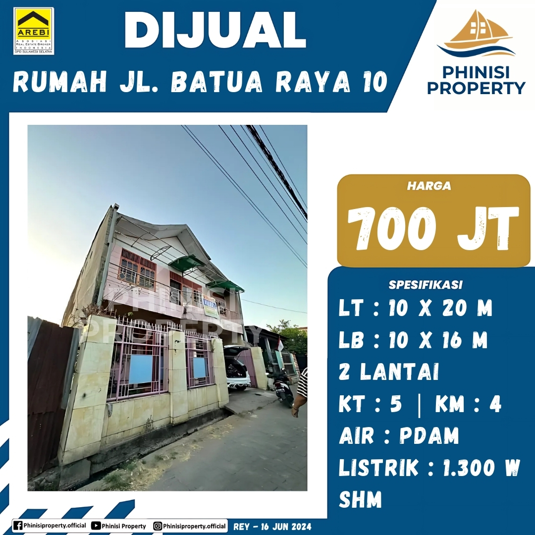 Dijual rumah keluarga yang luas dan fungsional di Jalan Batua Raya 10, Makassar. Dengan luas tanah 10x20 meter dan luas bangunan 10x16 meter yang terdiri dari dua lantai, rumah ini memiliki lima kamar tidur dan empat kamar mandi. Dilengkapi dengan pasokan air PDAM dan daya listrik 1.300W, properti ini menawarkan kenyamanan optimal untuk keluarga besar. Properti ini bersertifikat SHM.