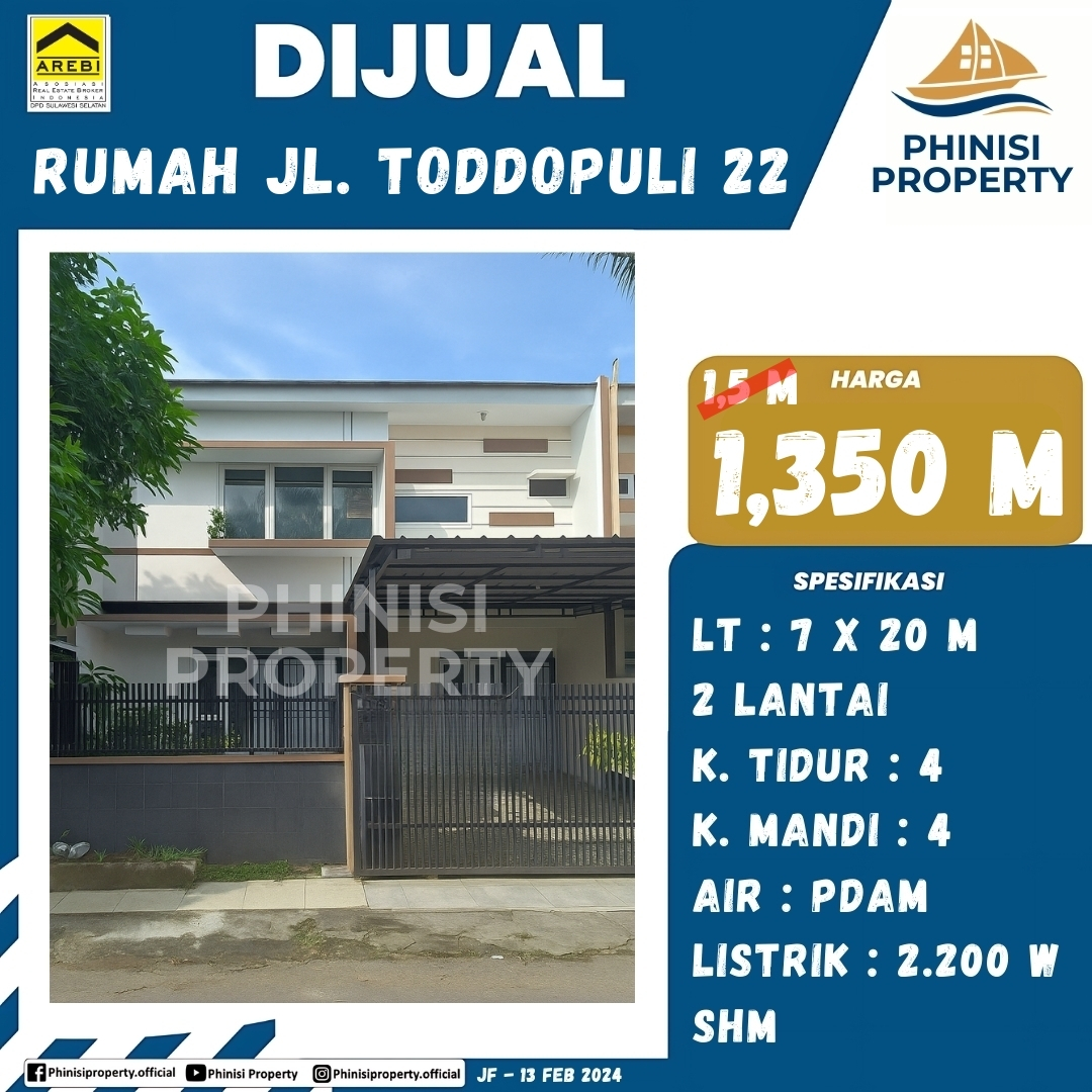 Dijual segera, rumah modern dua lantai yang berlokasi di Jalan Toddopuli. Properti ini sangat cocok untuk keluarga yang mencari hunian nyaman dengan ruang yang luas. Berdiri di atas tanah seluas 7×20 meter (140 m²), rumah ini menawarkan fungsionalitas dan kenyamanan. Dengan total 4 kamar tidur dan 4 kamar mandi, rumah ini sangat ideal untuk keluarga besar. Fasilitas yang tersedia mencakup air PDAM dan daya listrik 2.200 Watt. Properti ini memiliki status kepemilikan SHM (Sertifikat Hak Milik), menjadikannya pilihan investasi yang aman dan menjanjikan.