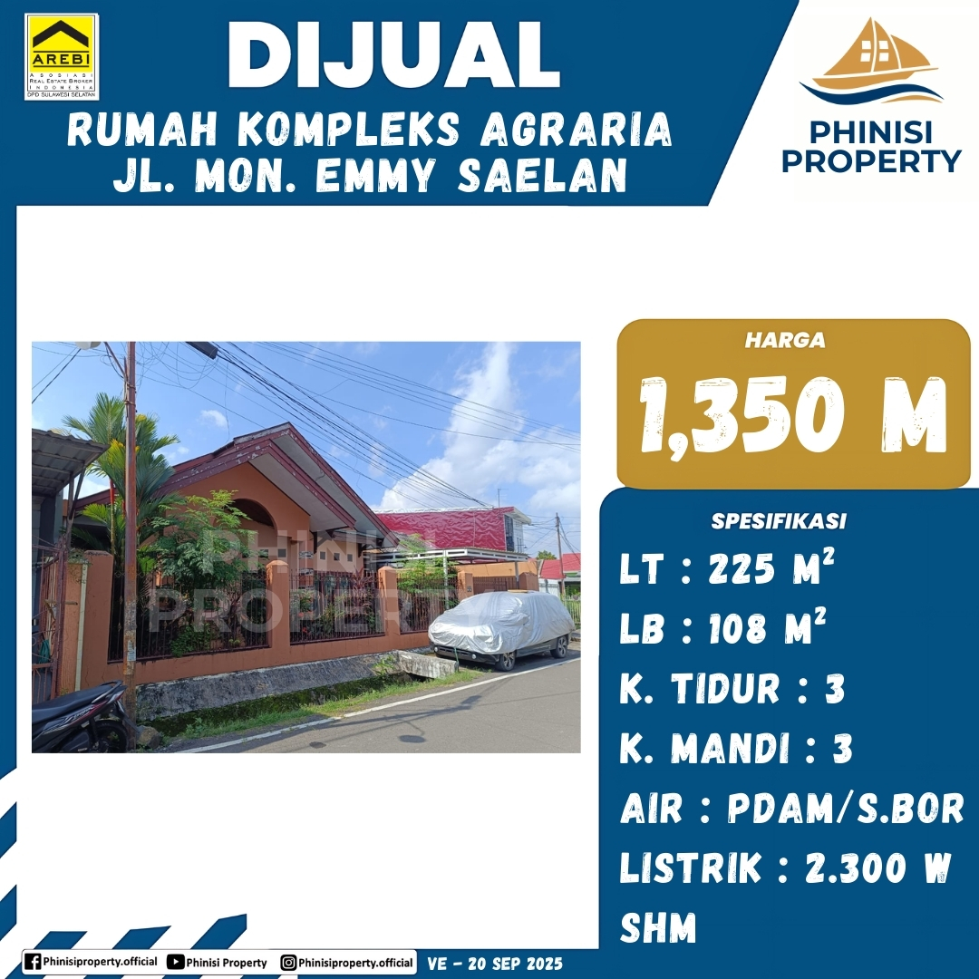 Dijual sebuah rumah siap huni di Kompleks Agraria, Jalan Mon. Emmy Saelan, Makassar. Rumah ini memiliki luas tanah 225 meter persegi dan luas bangunan 108 meter persegi.