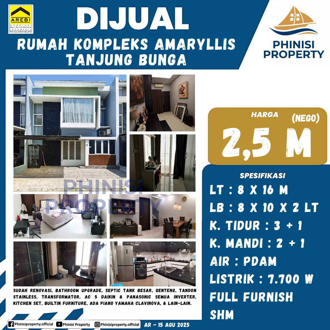 Dijual rumah mewah yang telah direnovasi di Kompleks Amarylis, Tanjung Bunga, Makassar. Properti ini berdiri di atas lahan seluas 8 meter x 16 meter, atau total 128 meter persegi, dan luas bangunan 8 meter x 10 meter di dua lantainya, atau total 160 meter persegi.