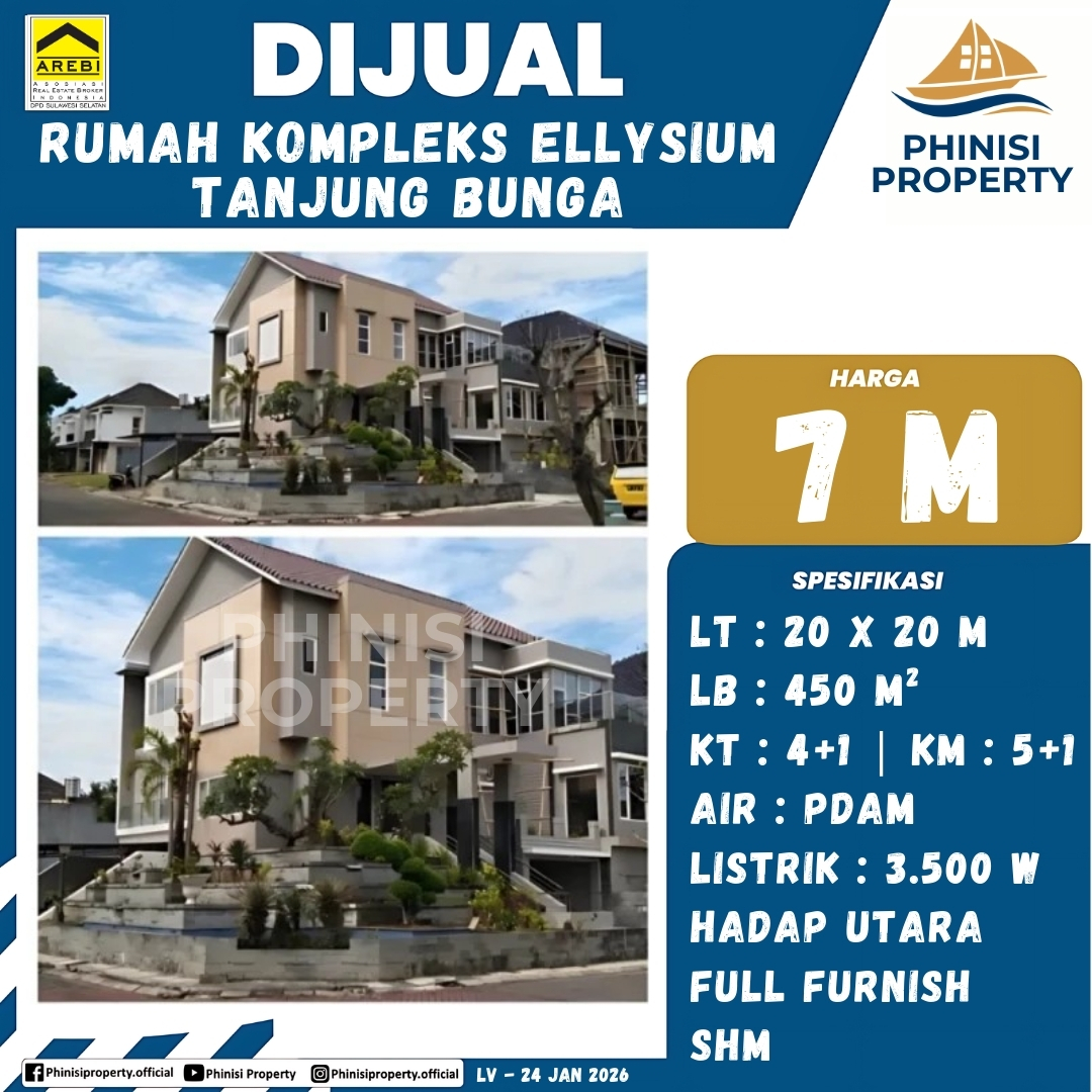 Sebuah rumah di Kompleks Ellysium, Tanjung Bunga, kini ditawarkan untuk dijual. Rumah ini berdiri di atas lahan seluas 400 meter persegi (20 x 20 meter) dan memiliki luas bangunan 450 meter persegi. Properti ini sangat ideal untuk keluarga besar, dilengkapi dengan 4+1 kamar tidur dan 5+1 kamar mandi. Rumah ini sudah terpasang listrik 3.500 watt dan air PDAM. Menghadap ke utara dan dalam kondisi full furnished, rumah ini siap untuk langsung dihuni. Legalitas properti ini juga terjamin karena sudah bersertifikat Hak Milik (SHM).