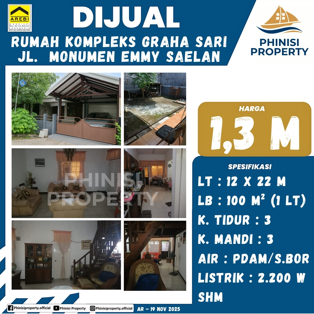 Temukan kenyamanan hunian ideal bagi keluarga Anda melalui penawaran rumah dijual di lokasi strategis Kompleks Graha Sari, tepatnya di Jalan Monumen Emmy Saelan yang mudah diakses. Properti satu lantai yang terawat ini berdiri di atas lahan luas berukuran 12 x 22 meter dengan luas bangunan 100 m², menghadirkan tata ruang fungsional yang mencakup 3 kamar tidur dan 3 kamar mandi, sangat cocok untuk mengakomodasi kebutuhan keluarga modern. Rumah ini telah dilengkapi dengan legalitas SHM yang aman, dukungan daya listrik 2.200 Watt, serta sumber air ganda (PDAM dan sumur bor) untuk menjamin ketersediaan air bersih setiap saat, menjadikannya pilihan tepat untuk tempat tinggal pribadi maupun investasi properti jangka panjang di kawasan yang tenang.