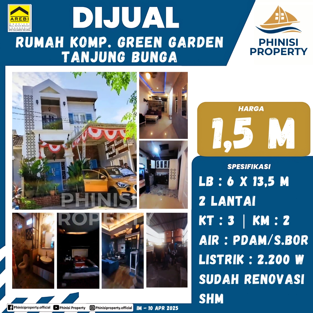Cari rumah dua lantai di kawasan Tanjung Bunga? Rumah ini bisa jadi pilihan tepat untuk Anda. Berlokasi di Komplex Green Garden, rumah dengan luas bangunan 6 x 13,5 meter ini memiliki 3 kamar tidur dan 2 kamar mandi. Rumah ini sudah dilengkapi dengan listrik 2.200 watt serta sumber air PDAM dan sumur bor. Kelebihan lainnya, sertifikat Hak Milik (SHM) sudah tersedia. Jangan lewatkan kesempatan untuk memiliki hunian nyaman dan strategis ini.