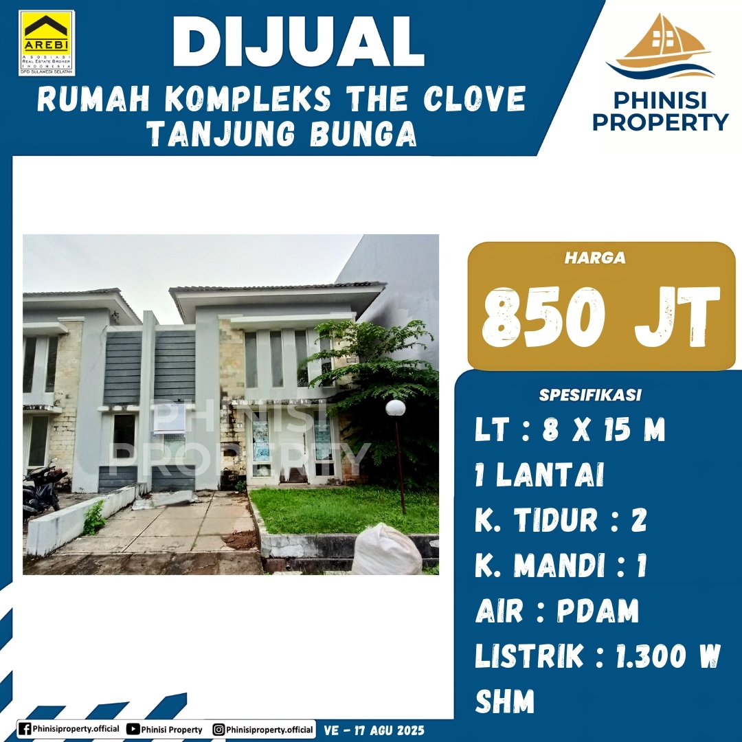 Dijual rumah 1 lantai yang berlokasi di Kompleks The Clove, Tanjung Bunga, menawarkan hunian yang nyaman dan terjangkau. Properti ini memiliki spesifikasi luas tanah 8 x 15 meter, dilengkapi dengan 2 kamar tidur dan 1 kamar mandi, ideal untuk keluarga kecil atau pasangan muda. Dengan fasilitas air PDAM dan daya listrik 1.300 watt, properti ini siap huni. Dengan sertifikat Hak Milik (SHM) yang menjamin legalitas, rumah ini adalah investasi yang aman. Berada di lingkungan perumahan yang tenang dan nyaman, properti ini merupakan pilihan tepat untuk tempat tinggal maupun investasi masa depan.