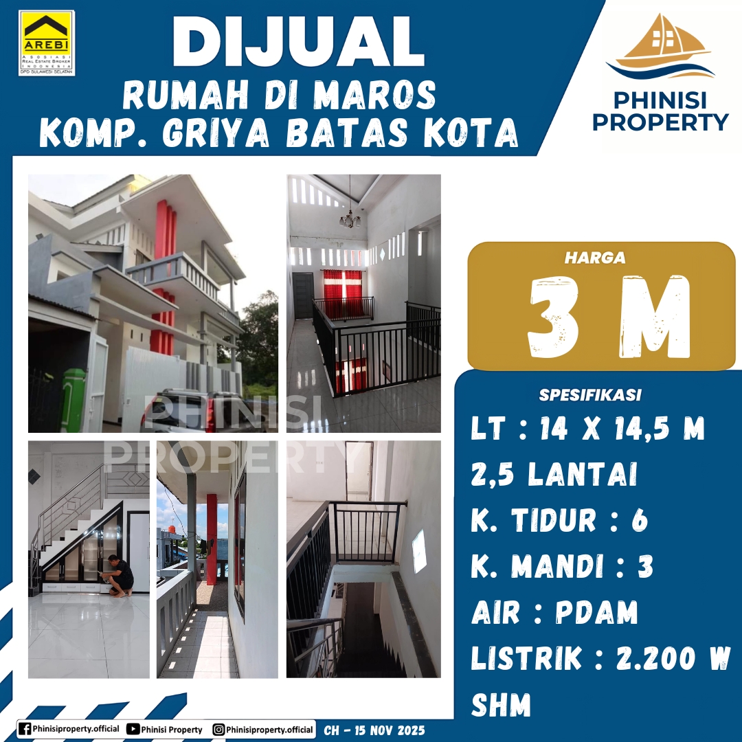 Dapatkan rumah berukuran besar dan berdesain modern di Kompleks Griya Batas Kota, Maros, sangat ideal untuk keluarga besar atau sebagai investasi penginapan. Properti ini menawarkan Luas Tanah 14 x 14,5 meter dengan bangunan yang dibangun secara optimal setinggi 2,5 Lantai, memberikan ruang yang luas dan fungsional. Rumah ini memiliki jumlah kamar yang sangat banyak, terdiri dari 6 Kamar Tidur dan 3 Kamar Mandi, menjamin kenyamanan bagi seluruh penghuni. Fasilitas pendukung meliputi pasokan air PDAM dan daya listrik 2.200 Watt. Keamanan legalitas properti ini terjamin karena sudah bersertifikat SHM (Sertifikat Hak Milik). Lokasinya di kompleks perumahan dekat batas kota menawarkan akses mudah ke Maros maupun Makassar.