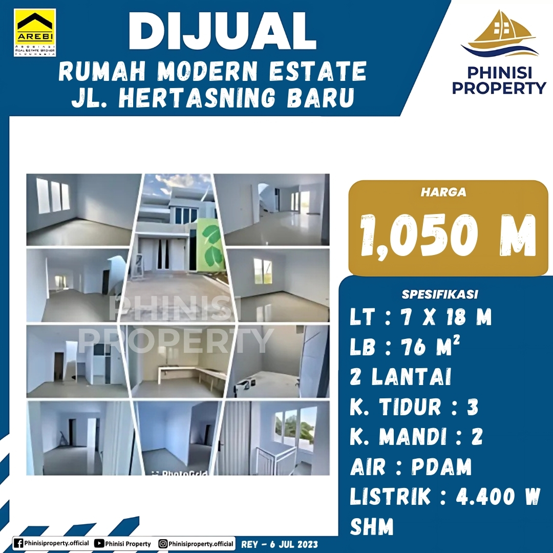 Miliki segera rumah modern dua lantai di perumahan Modern Estate, Hertasning Baru, yang menawarkan hunian nyaman dan fungsional. Properti ini memiliki luas tanah 7×18 meter dan luas bangunan 76 meter persegi, dengan tiga kamar tidur dan dua kamar mandi, ideal untuk keluarga. Dilengkapi dengan daya listrik 4.400 watt dan pasokan air PDAM, rumah ini siap huni. Status kepemilikan SHM menjamin legalitas properti ini. Jangan lewatkan kesempatan untuk memiliki hunian di lokasi yang strategis dan berkembang pesat.