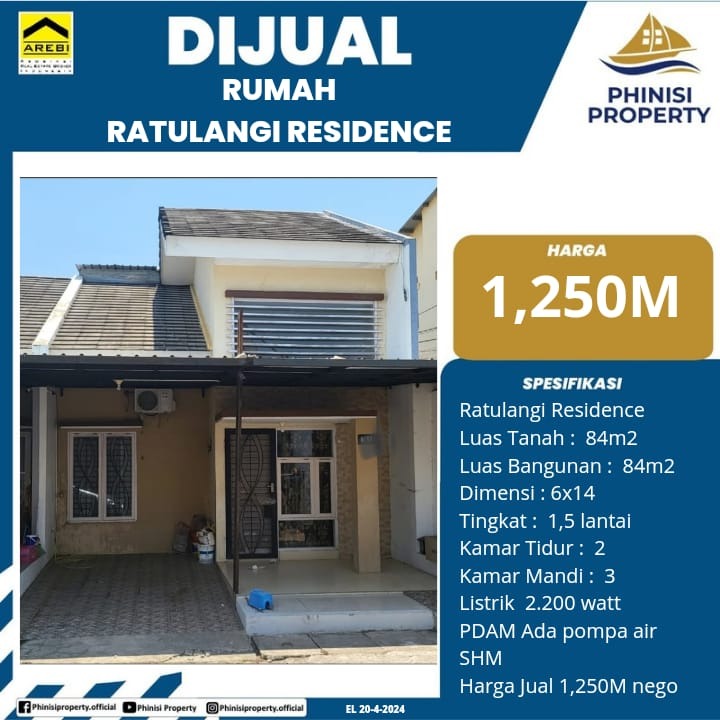 Rumah dijual di Ratulangi Residence ini adalah pilihan hunian yang sangat menarik. Properti ini memiliki luas tanah 84 m² dengan dimensi 6 x 14 meter dan luas bangunan 84 m² (1,5 lantai), memberikan ruang yang optimal untuk kenyamanan. Rumah ini dilengkapi dengan 2 kamar tidur dan 3 kamar mandi, sangat cocok untuk keluarga yang sedang berkembang. Fasilitas listrik 2.200 watt dan air PDAM dengan pompa air sudah tersedia. Legalitasnya pun terjamin dengan Sertifikat Hak Milik (SHM). Properti ini ditawarkan dengan harga yang kompetitif, menjadikannya kesempatan yang tidak boleh dilewatkan untuk memiliki hunian di lokasi premium.