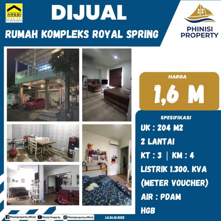 Rumah dua lantai ini terletak di dalam kompleks Royal Spring yang nyaman. Dengan luas tanah 204 meter persegi, rumah ini dilengkapi dengan tiga kamar tidur dan empat kamar mandi, sangat ideal untuk keluarga yang mencari ruang dan privasi. Rumah ini memiliki listrik 1.300 kVA dengan sistem meter voucher dan pasokan air PDAM. Desainnya yang minimalis dan lokasinya yang strategis di dalam kompleks perumahan yang aman menjadikannya pilihan sempurna untuk hunian jangka panjang.