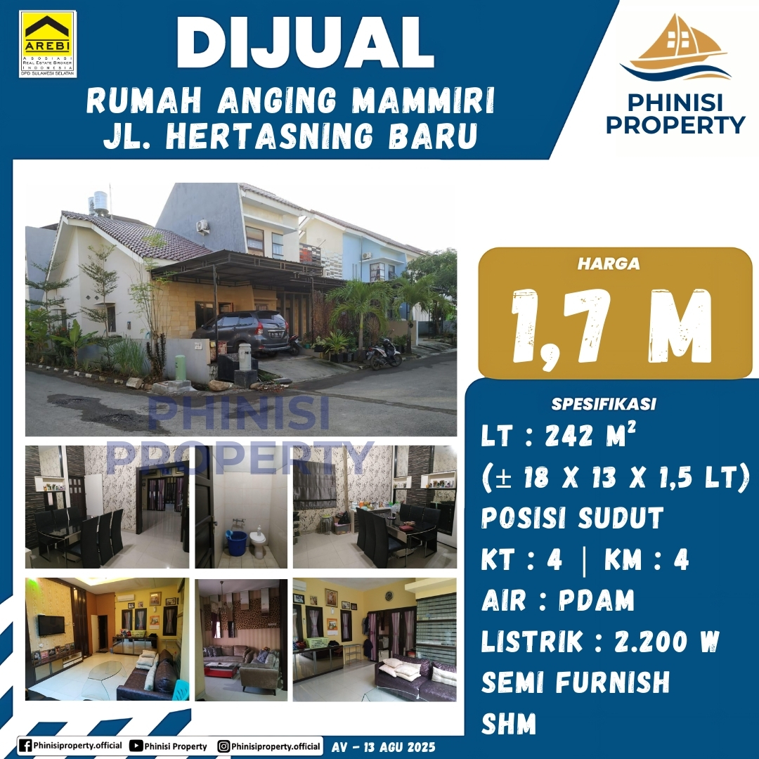 Dijual rumah satu setengah lantai di Taman Anging Mammiri, Jalan Hertasning Baru. Properti ini dibangun di atas lahan seluas 242 meter persegi, dengan perkiraan ukuran 18 m x 13 m. Posisi rumah berada di sudut, memberikan privasi dan akses lebih.