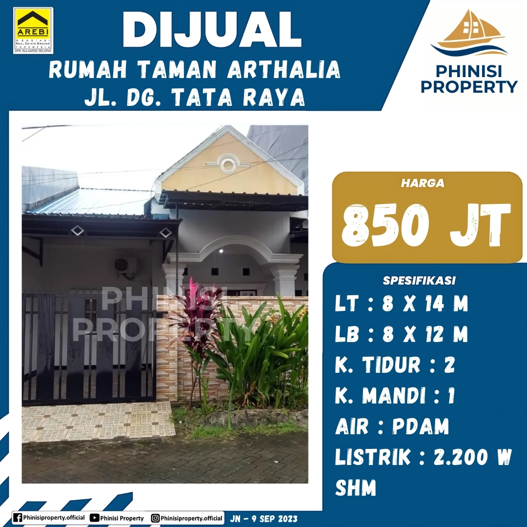 Dijual sebuah rumah di dalam kompleks Taman Arthalia, Jalan Daeng Tata Raya. Rumah ini memiliki luas tanah 112 meter persegi (8 x 14 meter) dan luas bangunan 96 meter persegi (8 x 12 meter). Properti ini dilengkapi dengan 2 kamar tidur, 1 kamar mandi, pasokan air PDAM, dan daya listrik 2.200 Watt. Rumah ini menawarkan hunian yang nyaman dan strategis bagi keluarga, dengan status kepemilikan Sertifikat Hak Milik (SHM).