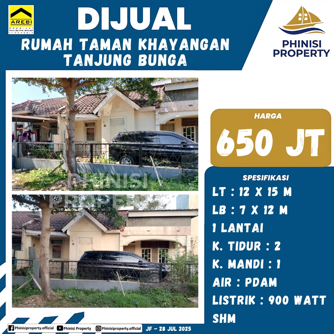 Dijual rumah satu lantai di Taman Khayangan, Tanjung Bunga, menawarkan hunian nyaman di lingkungan yang asri. Properti ini dibangun di atas lahan berukuran 12 m x 15 m, dengan total luas 180 meter persegi. Rumah ini memiliki luas bangunan 7 m x 12 m, dirancang secara fungsional untuk memenuhi kebutuhan keluarga.