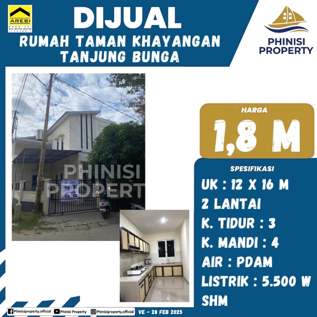 Mencari rumah dijual di kawasan elit Makassar? Rumah modern di Taman Khayangan Tanjung Bunga adalah pilihan sempurna untuk keluarga Anda! Dengan spesifikasi luas tanah 12 meter×16 meter, rumah 2 lantai ini menawarkan ruang yang luas dan nyaman. Dilengkapi dengan 3 kamar tidur dan 4 kamar mandi, properti ini sangat ideal untuk keluarga besar atau Anda yang membutuhkan banyak ruang. Rumah ini juga sudah dilengkapi dengan pasokan air PDAM dan daya listrik 5.500 Watt, memastikan kenyamanan hidup sehari-hari. Lokasinya yang strategis di Taman Khayangan, Tanjung Bunga, salah satu area residensial paling diminati di Makassar, menjamin lingkungan yang aman, nyaman, dan akses mudah ke berbagai fasilitas umum. Properti ini memiliki Sertifikat Hak Milik (SHM), memberikan rasa aman dan kepastian hukum bagi pembeli.