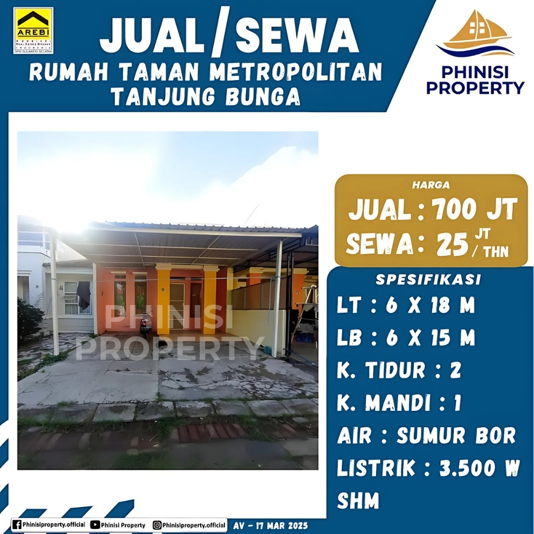 Rumah yang berlokasi di Taman Metropolitan, kawasan prestisius Tanjung Bunga, ini adalah pilihan hunian yang ideal bagi Anda yang mencari rumah dengan lingkungan nyaman. Dengan luas lahan 6 x 18 meter dan luas bangunan 6 x 15 meter, rumah ini menawarkan ruang yang efisien dan fungsional. Properti ini dilengkapi dengan dua kamar tidur dan satu kamar mandi, sangat cocok untuk keluarga kecil atau pasangan muda. Fasilitas dasar seperti pasokan air dari sumur bor dan daya listrik 3.500 watt juga sudah tersedia, memastikan kenyamanan harian. Dengan sertifikat Hak Milik (SHM) yang menjamin legalitas, rumah ini tidak hanya menawarkan tempat tinggal yang nyaman, tetapi juga merupakan investasi properti yang solid.