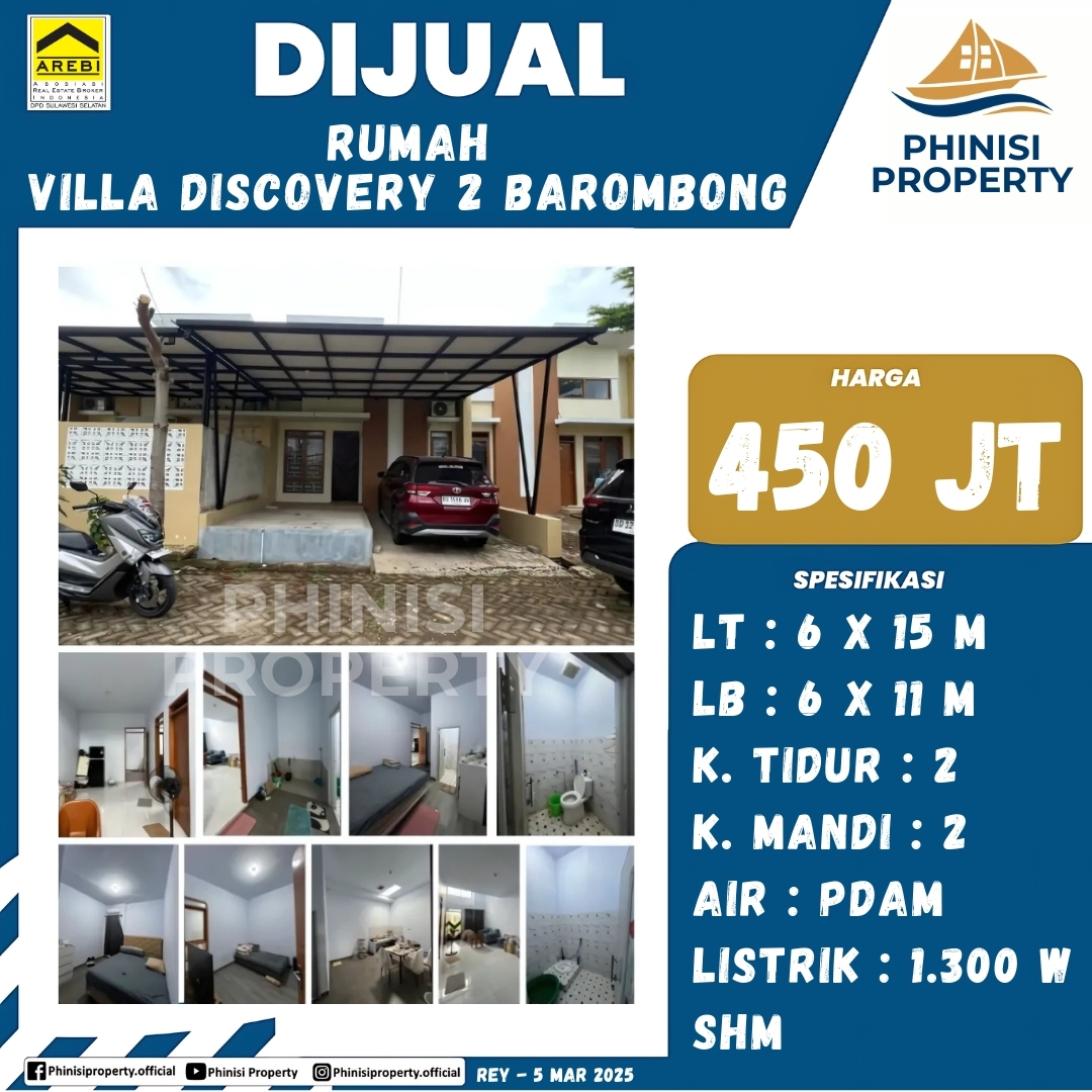 Dijual rumah minimalis modern yang terletak di perumahan Villa Discovery 2, Barombong. Properti ini memiliki spesifikasi ideal dengan luas tanah 6 x 15 meter dan luas bangunan 6 x 11 meter. Rumah ini dilengkapi dengan 2 kamar tidur dan 2 kamar mandi, cocok untuk keluarga kecil atau pasangan muda yang mencari hunian nyaman. Dengan fasilitas air PDAM dan daya listrik 1.300 watt, properti ini siap huni dan terawat dengan baik. Memiliki sertifikat Hak Milik (SHM), rumah ini menawarkan legalitas yang aman dan terjamin. Berada di lingkungan yang tenang dan nyaman, properti ini adalah pilihan tepat untuk tempat tinggal maupun investasi jangka panjang.