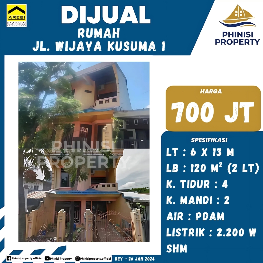 Dijual sebuah rumah siap huni di perumahan Wijaya Kusuma 1, ideal untuk keluarga yang mencari kenyamanan dan fungsionalitas. Dengan luas tanah 6x13 meter dan luas bangunan 120m², rumah dua lantai ini memiliki empat kamar tidur dan dua kamar mandi. Dilengkapi dengan daya listrik 2200W dan fasilitas air PDAM, properti ini menawarkan lingkungan yang nyaman dan lokasi strategis.