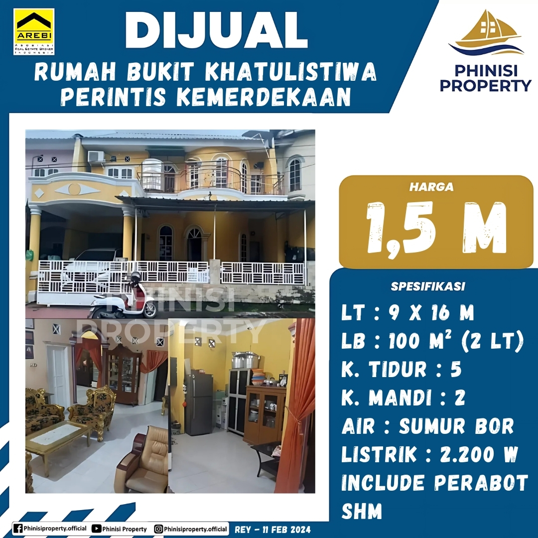 Dijual rumah keluarga yang nyaman dan siap huni di perumahan Bukit Khatulistiwa, Perintis Kemerdekaan. Dengan luas tanah 9x16 meter dan luas bangunan 100m² yang terdiri dari dua lantai, rumah ini memiliki lima kamar tidur dan dua kamar mandi. Keunggulan utamanya adalah kelengkapan perabot yang sudah termasuk dalam penjualan. Dilengkapi dengan air sumur bor dan daya listrik 2.200W, properti ini menawarkan kenyamanan optimal bagi calon penghuni.