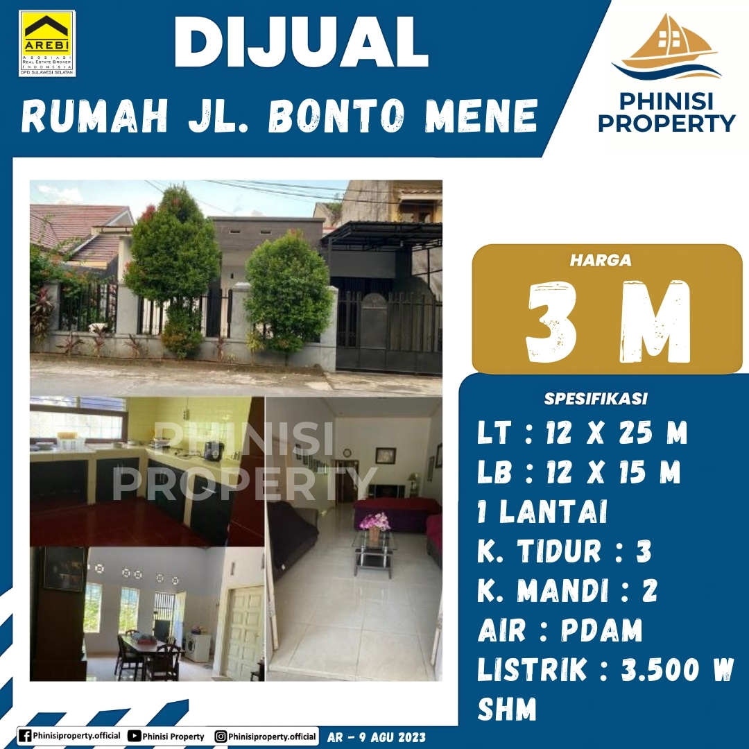 Sebuah hunian yang luas dan nyaman kini tersedia di Jalan Bonto Mene. Rumah ini memiliki luas tanah 300 m² (12x25) dan luas bangunan 180 m² (12x15), ideal untuk keluarga besar. Terdapat 3 kamar tidur dan 2 kamar mandi, serta dilengkapi dengan daya listrik 3.500 watt dan air PDAM. Properti ini sudah bersertifikat SHM, menjamin keamanan investasi Anda. Dengan ruang tamu dan dapur yang luas, rumah ini siap menjadi tempat tinggal yang sempurna bagi Anda dan keluarga.