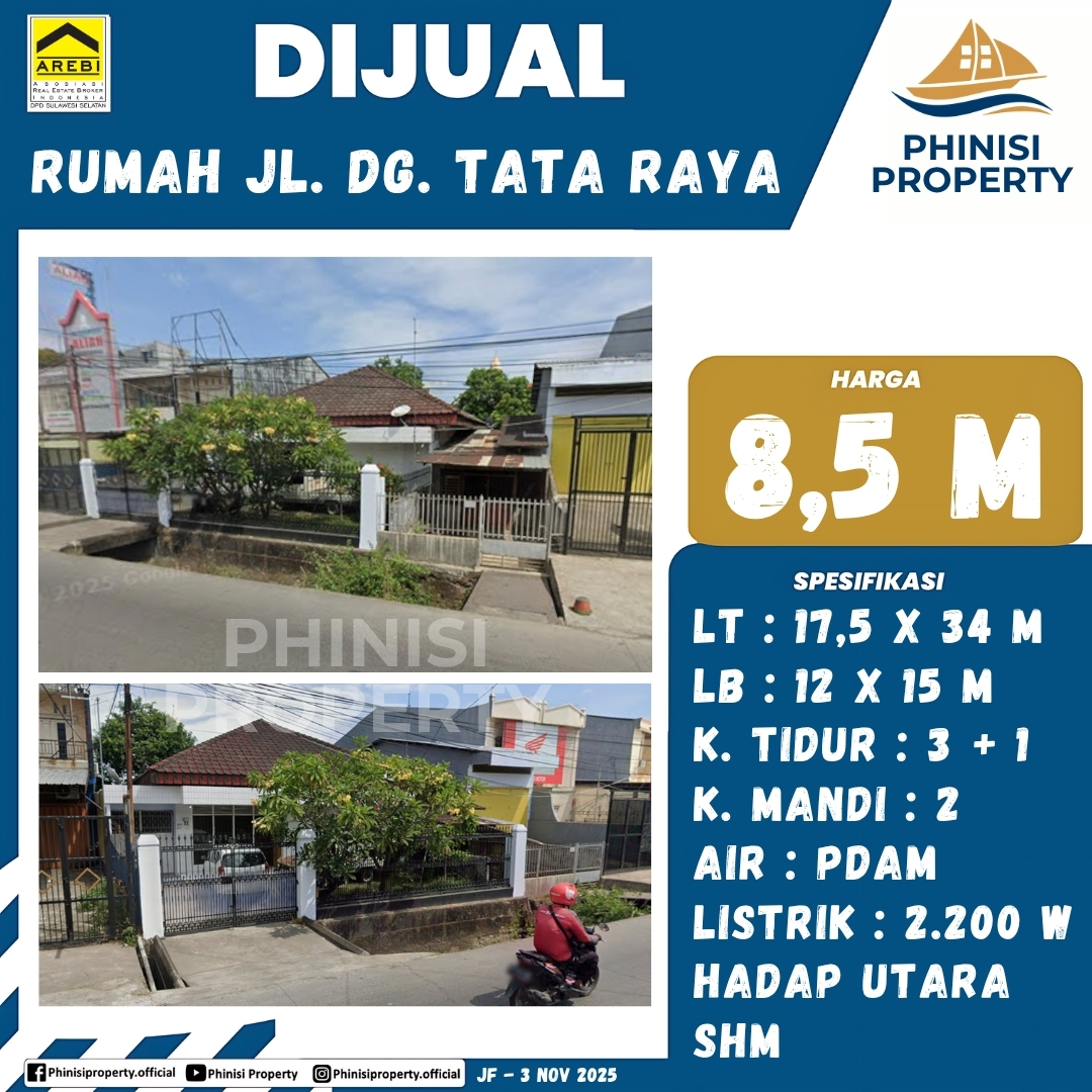 emukan properti impian dengan dimensi fantastis di lokasi premium, yaitu Rumah di Jalan Daeng Tata Raya. Hunian ini menawarkan Luas Tanah yang sangat luas, mencapai 17,5 x 34 meter, dengan Luas Bangunan 12 x 15 meter, menjadikannya sangat ideal untuk keluarga besar atau pengembangan di masa depan. Rumah ini dilengkapi dengan fasilitas kamar yang lengkap, terdiri dari 3 Kamar Tidur Utama dan 1 Kamar Tidur Asisten, serta 2 Kamar Mandi yang fungsional. Untuk kenyamanan harian, properti ini didukung pasokan air PDAM dan daya listrik 2.200 Watt, dan memiliki orientasi hadap Utara. Legalitas rumah ini terjamin aman karena bersertifikat SHM (Sertifikat Hak Milik). Lokasi di Jalan Dg. Tata Raya menjamin akses mudah ke pusat kota dan fasilitas publik, menjadikannya pilihan hunian yang strategis dan bernilai investasi tinggi.