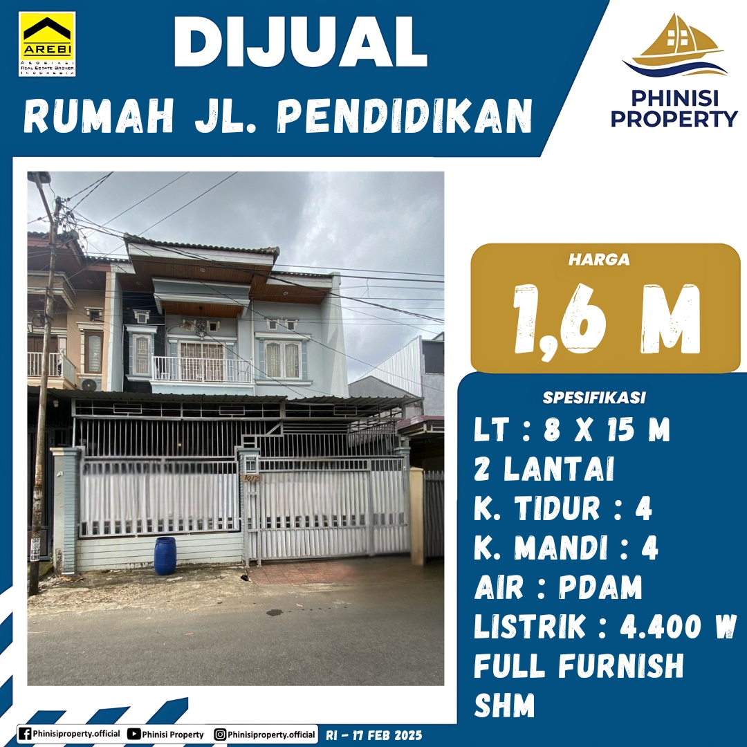 Miliki hunian siap huni di Jalan Pendidikan, Makassar, yang ideal untuk keluarga besar atau sebagai properti sewa. Rumah dua lantai ini memiliki luas tanah 8 x 15 meter atau total 120 m², dengan tata ruang yang sangat lengkap, terdiri dari 4 kamar tidur dan 4 kamar mandi. Dilengkapi dengan daya listrik 4.400 watt dan air PDAM, rumah ini sangat efisien. Properti ini dijual dalam kondisi full furnish, sehingga Anda bisa langsung pindah tanpa perlu repot. Dengan status kepemilikan Sertifikat Hak Milik (SHM), rumah ini menawarkan investasi yang aman dan nyaman di lokasi yang strategis.