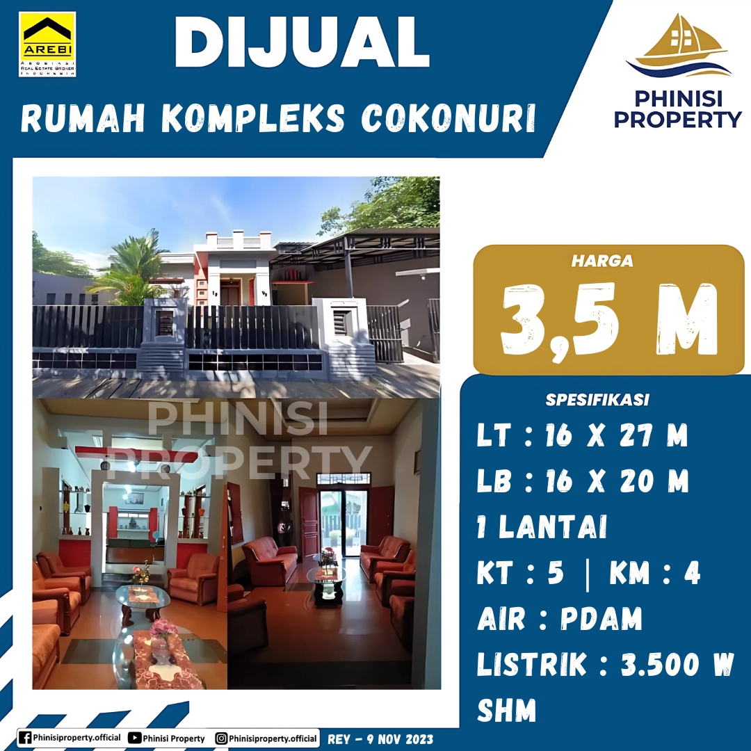 Rumah eksklusif di Kompleks Cokonuri menawarkan hunian ideal bagi keluarga besar. Dengan luas tanah yang lapang (16x27 meter) dan bangunan (16x20 meter), rumah satu lantai ini memiliki lima kamar tidur dan empat kamar mandi yang memberikan privasi dan kenyamanan maksimal. Dilengkapi dengan listrik 3500W dan air PDAM, properti ini siap huni dan menjanjikan gaya hidup modern. Jangan lewatkan kesempatan memiliki hunian strategis dan nyaman di lokasi favorit.