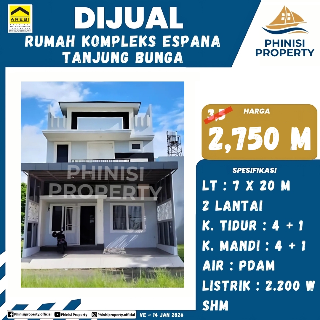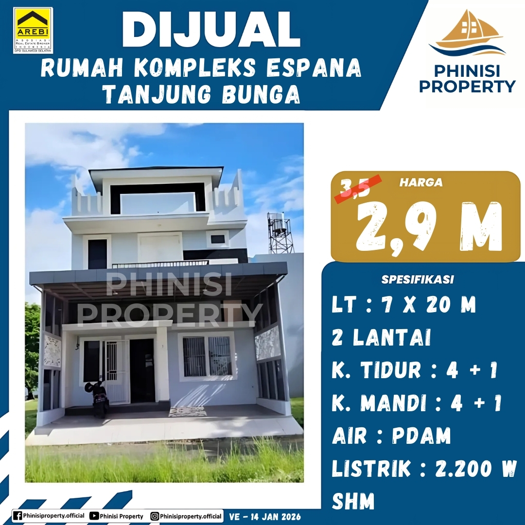 Mencari rumah dijual di kawasan elite Tanjung Bunga Makassar? Rumah di Kompleks Espana adalah pilihan sempurna untuk keluarga Anda! Dengan ukuran 7 meter×20 meter, rumah ini menawarkan ruang yang efisien dan fungsional. Dilengkapi dengan 4 1 kamar tidur dan 4 1 kamar mandi, properti ini sangat ideal untuk keluarga besar atau Anda yang membutuhkan banyak ruang privasi.