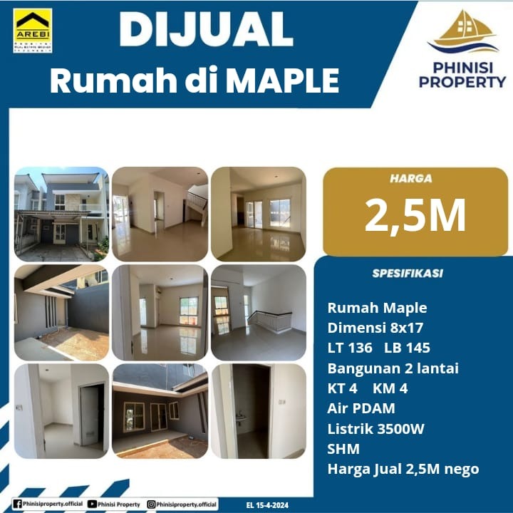 Mencari hunian nyaman dan modern di Makassar? Rumah di Maple adalah pilihan yang ideal. Rumah 2 lantai ini memiliki dimensi 8 x 17 meter, dengan luas tanah 136 meter persegi dan luas bangunan 145 meter persegi. Dilengkapi dengan 4 kamar tidur dan 4 kamar mandi, properti ini juga memiliki fasilitas air PDAM dan daya listrik 3.500 watt. Dengan Sertifikat Hak Milik (SHM), rumah ini menawarkan kenyamanan dan nilai investasi yang sangat menjanjikan di kawasan yang strategis.