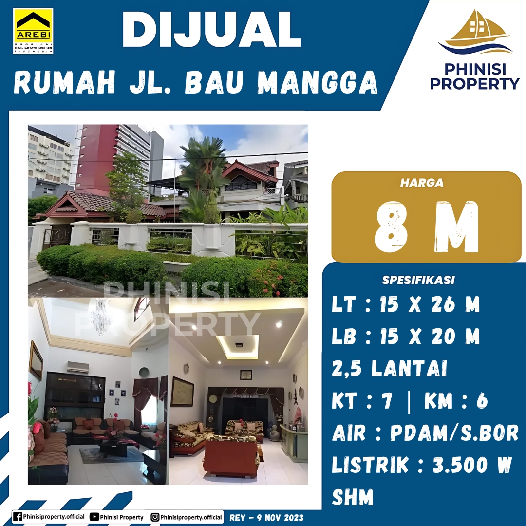 Miliki segera rumah di lokasi premium, Jalan Bau Mangga, yang menawarkan hunian yang luas dan mewah. Properti ini memiliki 2,5 lantai dengan luas tanah 15×26 meter dan luas bangunan 15×20 meter, sangat ideal untuk keluarga besar. Terdiri dari tujuh kamar tidur dan enam kamar mandi, rumah ini menjamin privasi dan kenyamanan bagi setiap anggota keluarga. Dilengkapi dengan daya listrik 3.500 watt dan pasokan air dari PDAM serta sumur bor, rumah ini siap huni. Status kepemilikan SHM menjamin legalitas properti ini. Jangan lewatkan kesempatan untuk memiliki hunian impian di lokasi strategis.