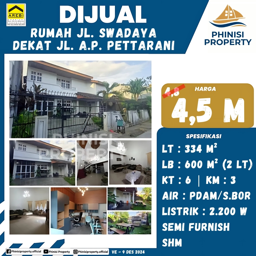 Mencari rumah dijual untuk keluarga besar di Makassar dengan akses mudah ke pusat kota? Rumah di Jalan Swadaya, berlokasi sangat dekat dengan Jalan AP Pettarani, adalah pilihan ideal untuk Anda! Dengan luas tanah 334 meter persegi dan luas bangunan 600 meter persegi yang terbagi dalam 2 lantai, rumah ini menawarkan ruang yang sangat lapang dan nyaman untuk seluruh anggota keluarga.