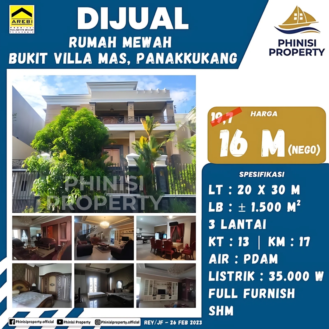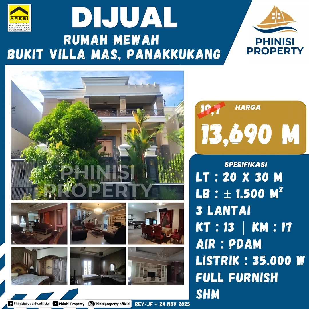 Miliki segera hunian mewah tiga lantai di kawasan elit Bukit Villa Mas, Panakkukang. Properti ini menawarkan kemewahan dan ruang yang luar biasa dengan luas tanah 20×30 meter dan luas bangunan sekitar 1.500 meter persegi. Rumah ini memiliki 13 kamar tidur dan 17 kamar mandi, sangat ideal untuk keluarga besar atau sebagai investasi. Dilengkapi dengan daya listrik 35.000 watt dan pasokan air PDAM, rumah ini dijual dalam kondisi full furnish siap huni. Status kepemilikan SHM menjamin legalitas properti. Jangan lewatkan kesempatan untuk memiliki rumah impian di lokasi premium ini.
