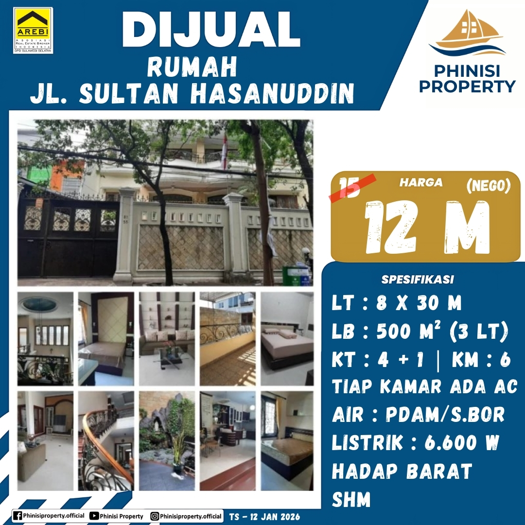 Rumah mewah yang berlokasi di Jalan Sultan Hasanuddin ini menawarkan hunian eksklusif di salah satu kawasan premium. Dengan luas tanah (LT) 8 meter x 30 meter, properti ini memiliki total 240 m². Luas bangunannya sangat besar, mencapai 500 m² dengan tiga lantai, memberikan ruang yang sangat lega untuk seluruh anggota keluarga. Rumah ini memiliki 4+1 kamar tidur dan 6 kamar mandi, serta dilengkapi dengan AC di setiap kamar untuk kenyamanan maksimal. Daya listriknya sebesar 6.600 watt dan pasokan air berasal dari PDAM serta sumur bor. Status kepemilikannya sudah Sertifikat Hak Milik (SHM), menjamin keamanan transaksi. Dengan desain yang elegan dan fasilitas lengkap, rumah ini adalah pilihan ideal untuk investasi jangka panjang dan gaya hidup mewah.