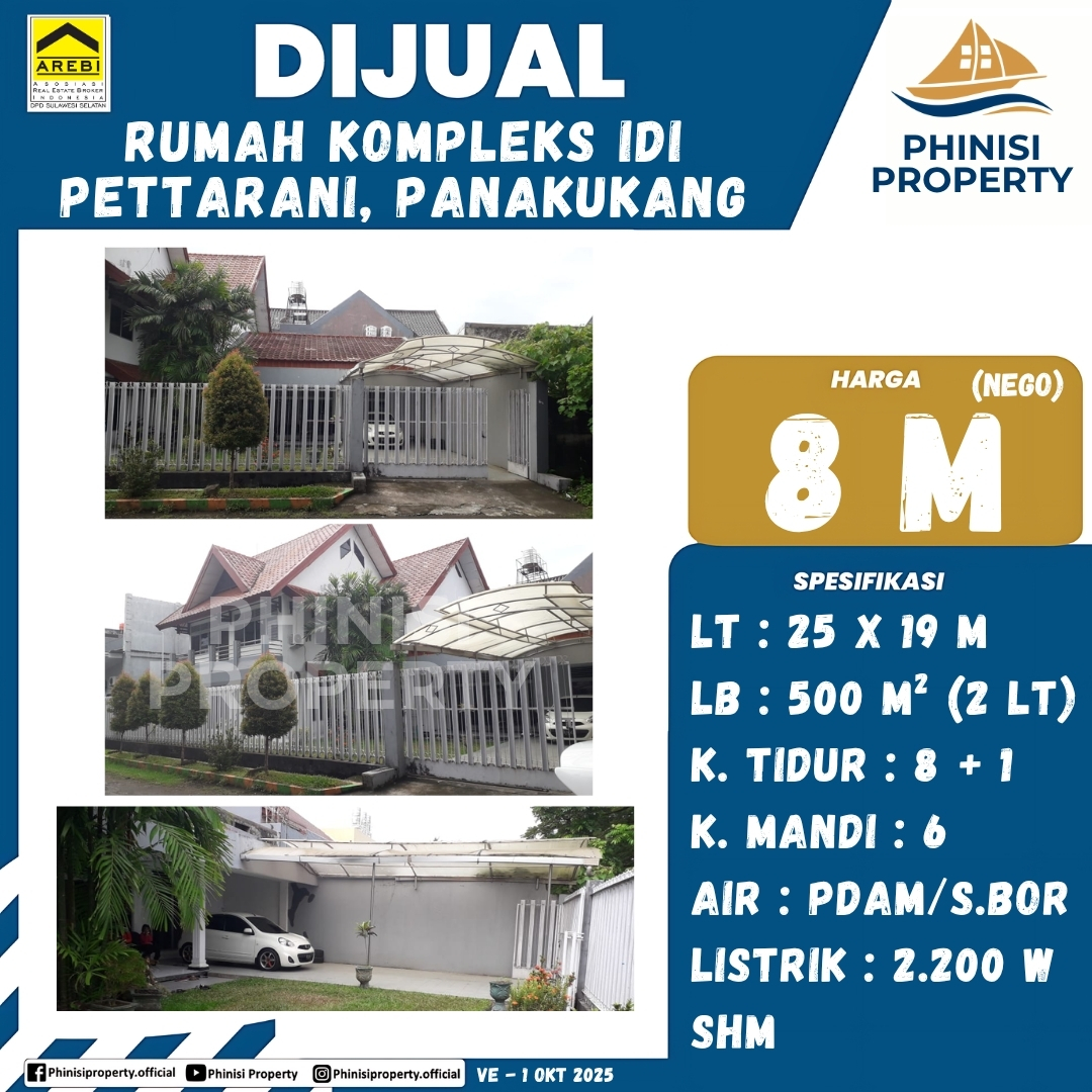 Miliki kesempatan langka mendapatkan hunian eksklusif di lokasi super strategis, Kompleks IDI Pettarani, Panakukang. Rumah idaman ini menawarkan spesifikasi yang luar biasa: Luas Tanah (LT) 475 m 2 (didapat dari 25 meter×19 meter) dengan Luas Bangunan (LB) 500 m 2 yang terdiri dari dua lantai (2 LT), memastikan ruang gerak yang sangat leluasa. Dengan 8 kamar tidur utama plus 1 kamar tidur asisten, total 9 kamar tidur, dan 6 kamar mandi, properti ini sangat ideal untuk keluarga besar atau investasi properti premium di Makassar. Fasilitas pendukungnya lengkap, mulai dari air PDAM/Sumur Bor dan daya listrik yang memadai, hingga status kepemilikan Sertifikat Hak Milik (SHM) yang menjamin legalitas. Jangan lewatkan properti mewah dengan lokasi emas ini!