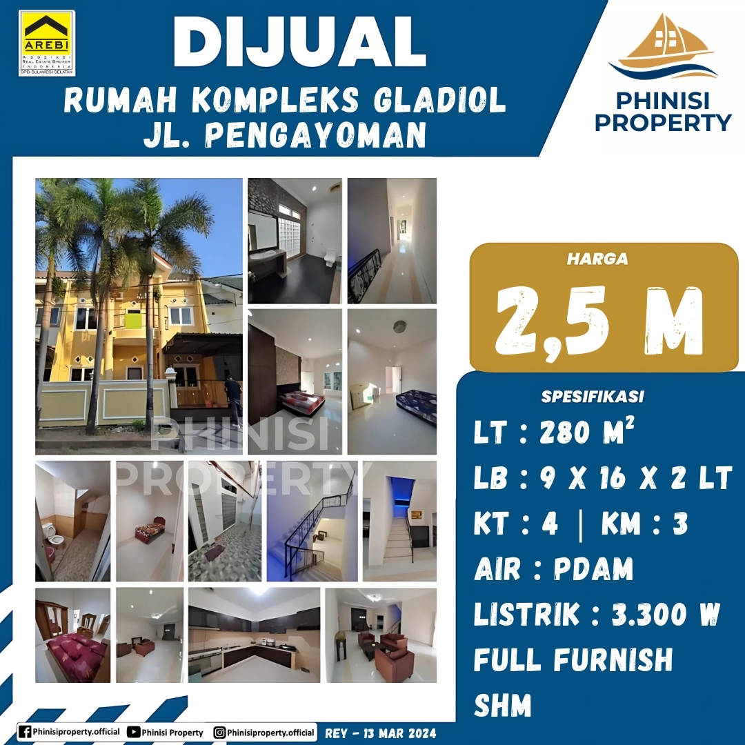 Dijual rumah mewah yang siap huni dan sudah dilengkapi perabot di Kompleks Gladiol, Jalan Pengayoman. Dengan luas tanah yang sangat besar (280m²) dan luas bangunan 9x16 meter yang terdiri dari dua lantai, properti ini menawarkan ruang yang lapang dan nyaman. Rumah ini memiliki empat kamar tidur dan tiga kamar mandi, serta didukung fasilitas air PDAM dan listrik 3.300W. Kondisi full furnish membuatnya sangat ideal untuk keluarga yang ingin pindah tanpa perlu repot membeli perabot. Properti ini bersertifikat SHM.
