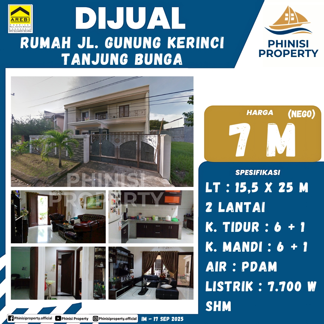 Dijual sebuah rumah mewah yang berlokasi di Jalan Gunung Kerinci, Tanjung Bunga, sebuah kawasan elite dan strategis di Makassar. Rumah berlantai dua ini memiliki luas tanah 387,5 meter persegi, yang didapat dari perkalian 15,5 meter kali 25 meter.