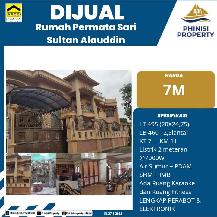 Mencari hunian impian di Makassar? Rumah Permata Sari Sultan Alauddin bisa jadi pilihan ideal. Berdiri di atas tanah seluas 495 meter persegi, atau 20 x 24,75 meter, properti ini memiliki luas bangunan 460 meter persegi dan terdiri dari 2,5 lantai. Rumah ini memiliki 7 kamar tidur dan 11 kamar mandi, menjadikannya sangat cocok untuk keluarga besar. Dilengkapi dengan listrik 2 meteran @ 7000 watt, air sumur dan PDAM, serta sertifikat SHM dan IMB, rumah ini siap huni. Selain itu, properti ini juga menawarkan fasilitas tambahan seperti ruang karaoke dan ruang fitness. Dengan kelengkapan perabot dan elektronik, rumah ini memberikan kenyamanan maksimal bagi penghuninya dan merupakan investasi yang sangat berharga.