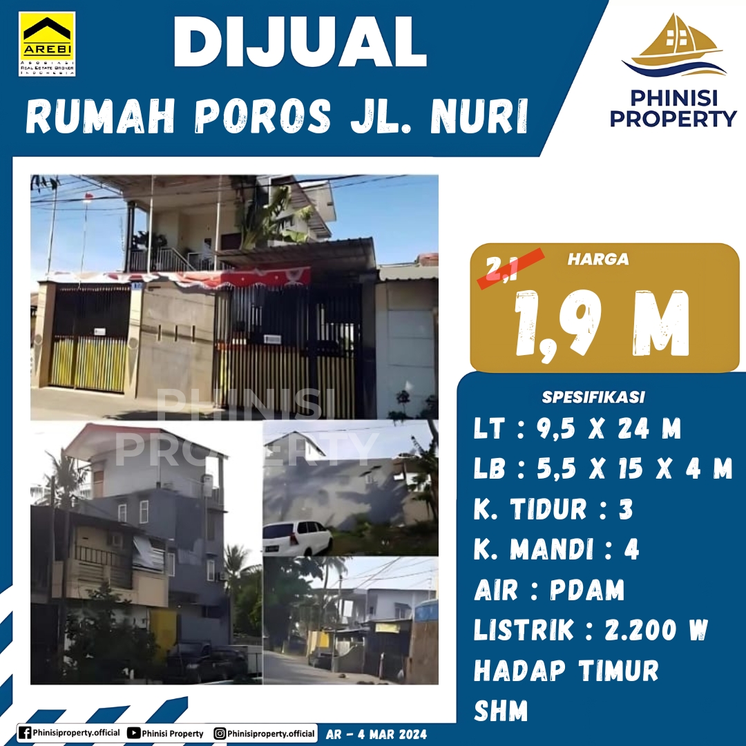 Tersedia rumah di Poros Jalan Nuri, lokasi yang ideal untuk tempat tinggal maupun investasi. Properti ini memiliki luas tanah 9,5 x 24 meter dengan luas bangunan 5,5 x 15 x 4 meter. Dilengkapi dengan tiga kamar tidur dan empat kamar mandi, rumah ini menawarkan ruang yang cukup untuk keluarga. Pasokan air PDAM dan daya listrik 2200 watt tersedia, menjamin kenyamanan sehari-hari. Menghadap ke arah timur dan memiliki Sertifikat Hak Milik (SHM), rumah ini adalah pilihan yang aman dan menjanjikan di lokasi yang mudah diakses.