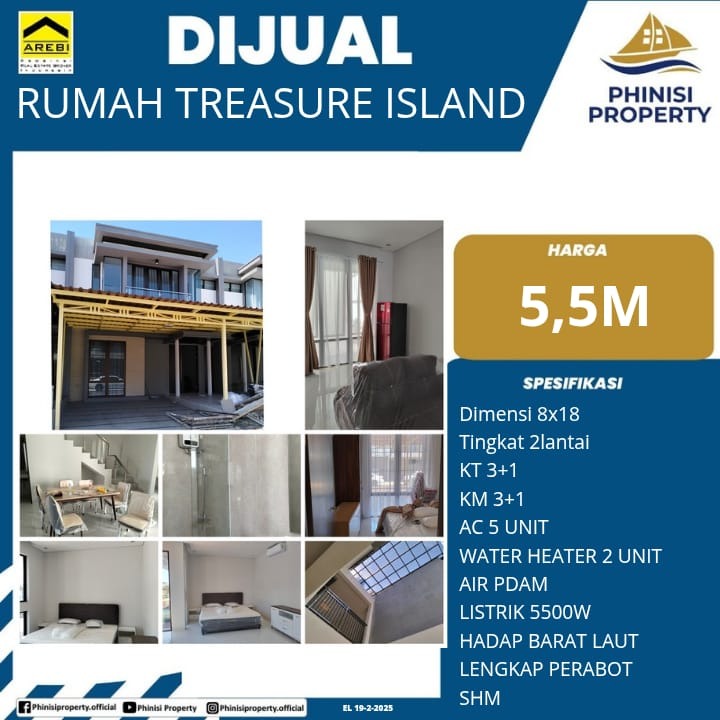 Mencari hunian mewah yang siap huni di Makassar? Rumah Treasure Island adalah pilihan yang tepat. Berdiri di atas tanah berdimensi 8 x 18 meter, rumah 2 lantai ini memiliki 3 1 kamar tidur dan 3 1 kamar mandi. Dilengkapi dengan 5 unit AC dan 2 unit pemanas air (water heater), properti ini sudah memiliki fasilitas air PDAM dan listrik 5.500 watt. Rumah ini menghadap ke Barat Laut dan dijual lengkap dengan perabot. Dengan Sertifikat Hak Milik (SHM), rumah ini menawarkan kenyamanan dan nilai investasi yang sangat tinggi.